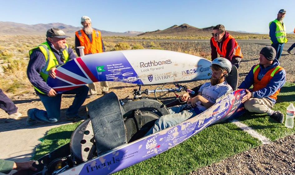The University of Liverpool Velocipede (ULV) team, designed & built their recumbent bicycle ARION1 and transported it to Nevada and raced it in the International Human Powered Vehicle Association’s World Human Powered Speed Challenge 2015. The race is held on a 5 mile course on an ordinary road, accelerating up to a 200m flat section where speeds are measured & recorded. The driver of the ARION1 is positioned inside the vehicle’s aerodynamic carbon fibre shell, and sees where he is going using a small video camera mounted at the top of the vehicle.